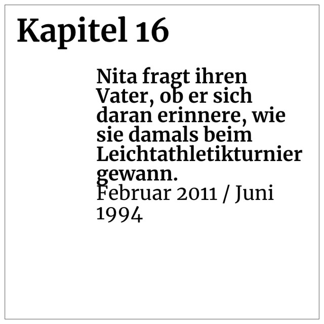 Kapitel 16: Nita fragt ihren Vater, ob er sich daran erinnere, wie sie damals beim Leichtathletikturnier gewann. (Februar 2011 / Juni 1994)
