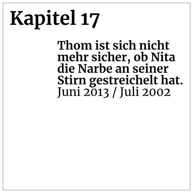 Kapitel 17: Thom ist sich nicht mehr sicher, ob Nita die Narbe an seiner Stirn gestreichelt hat. (Juni 2013 / Juli 2002)