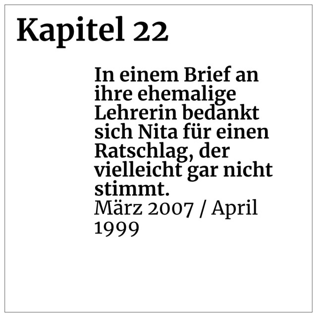 Kapitel 22: In einem Brief an ihre ehemalige Lehrerin bedankt sich Nita für einen Ratschlag, der vielleicht gar nicht stimmt. (März 2007 / April 1999)